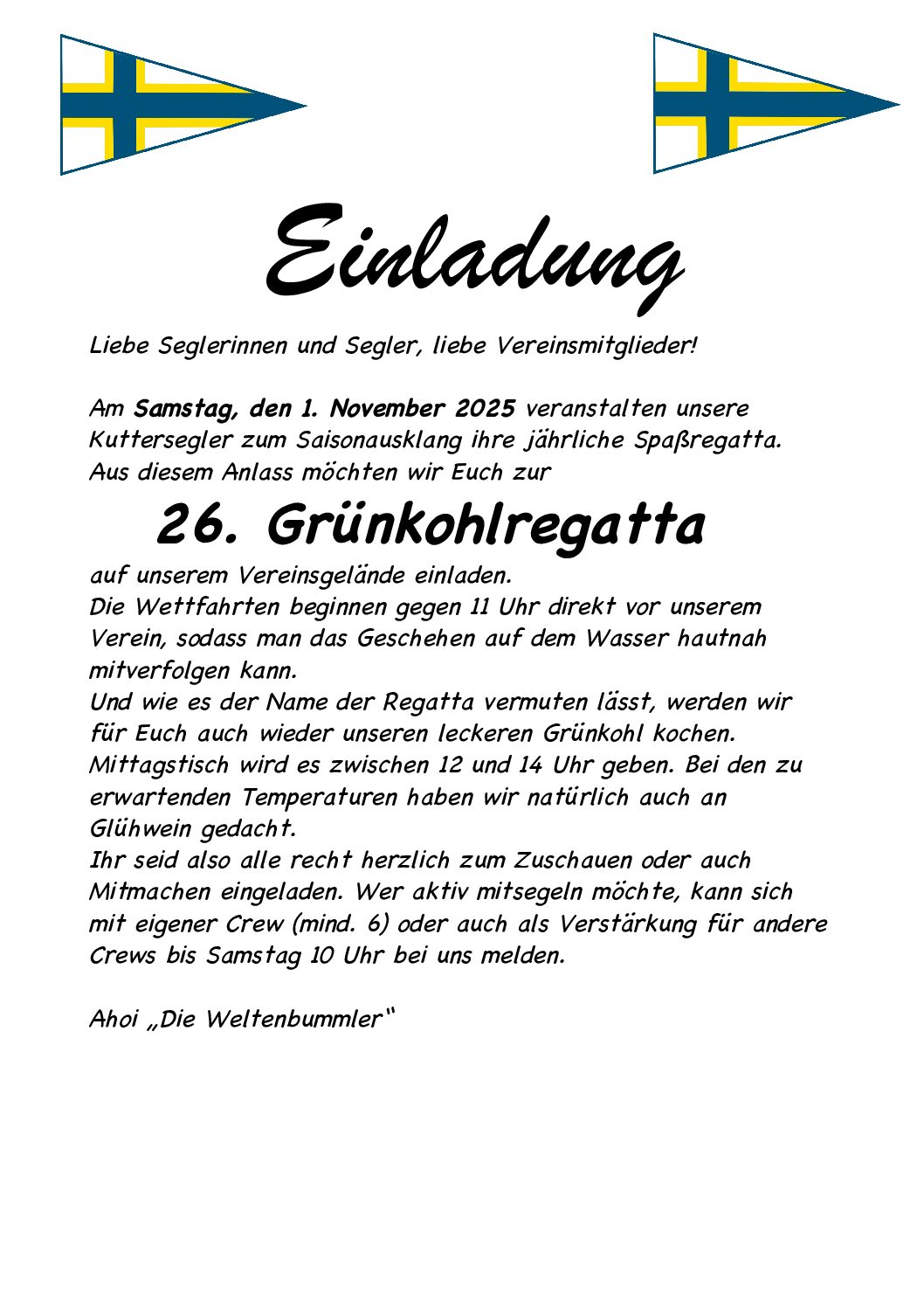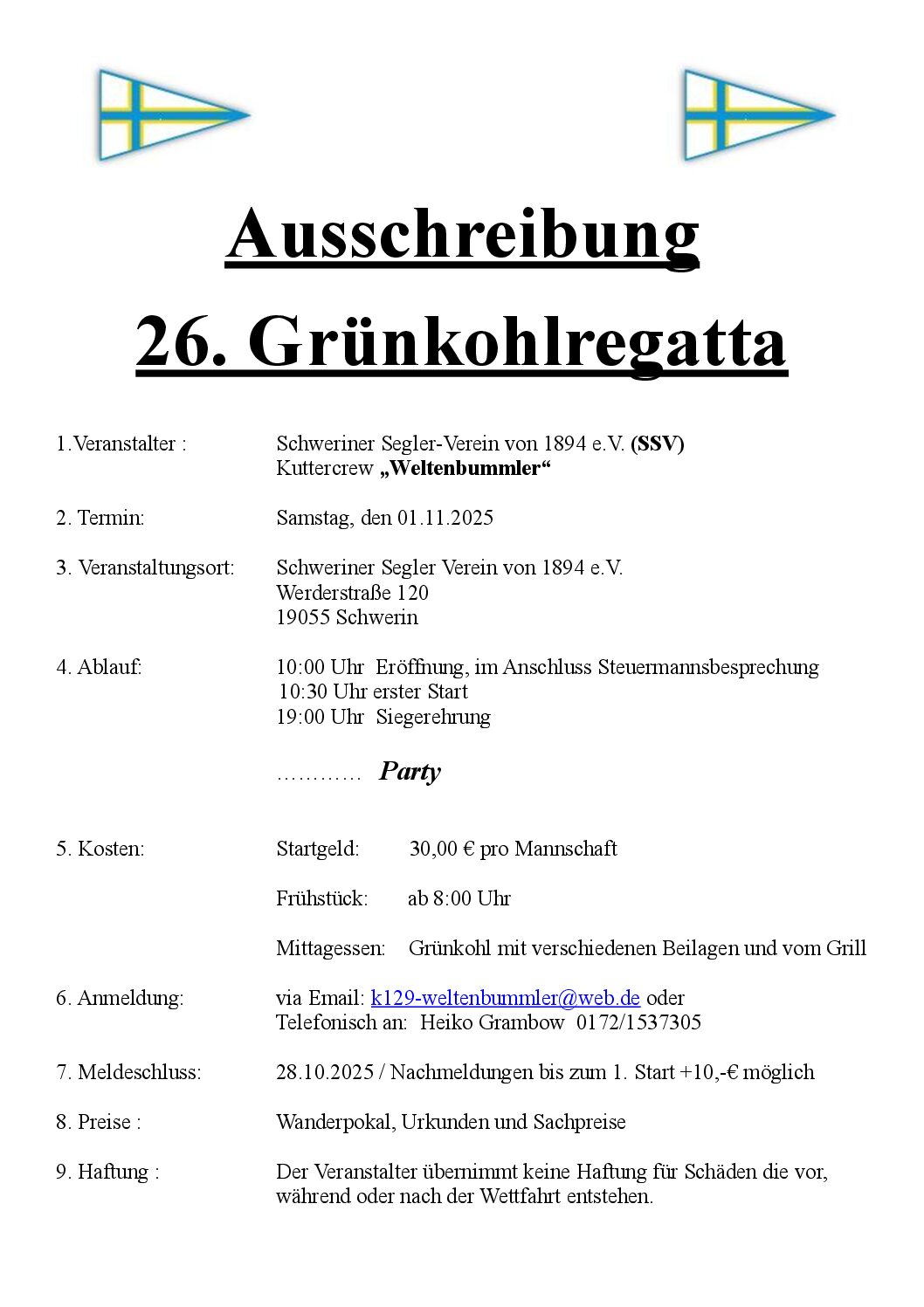 Die Grünkohlregatta der Kuttersegler zum Saisonausklang wird abwechselnd vom Schweriner Marineclub und dem SSV ausgerichtet. Somit wechselt der Veranstaltungsort jedes Jahr. Für die Durchführung der Regatta zeichnete die Crew unseres Vereinskutters „Weltenbummler“ verantwortlich.